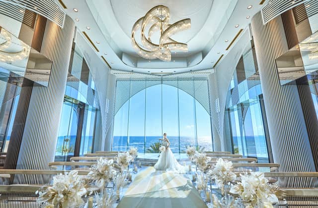 チャペルの扉を開いた途端、明るい光が差し、目の前には青い海の絶景が広がります。